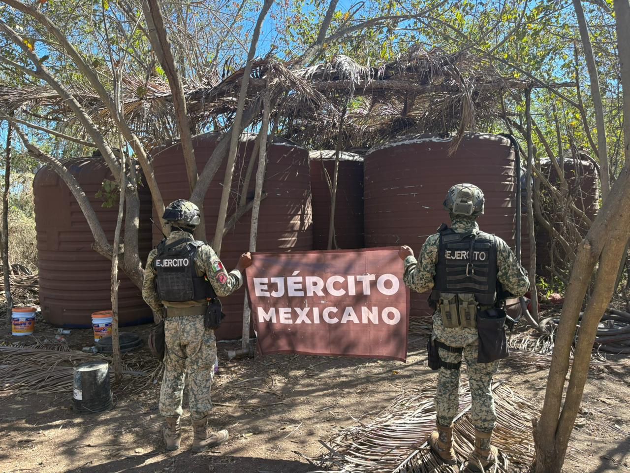 Elementos del Ejército Mexicano aseguraron 40 depósitos de combustible con capacidad aproximada de 10 mil litros cada uno, ocultos entre la maleza en el poblado de Palmillas, municipio de Mazatlán, Sinaloa, tras realizar patrullamientos preventivos en la zona.