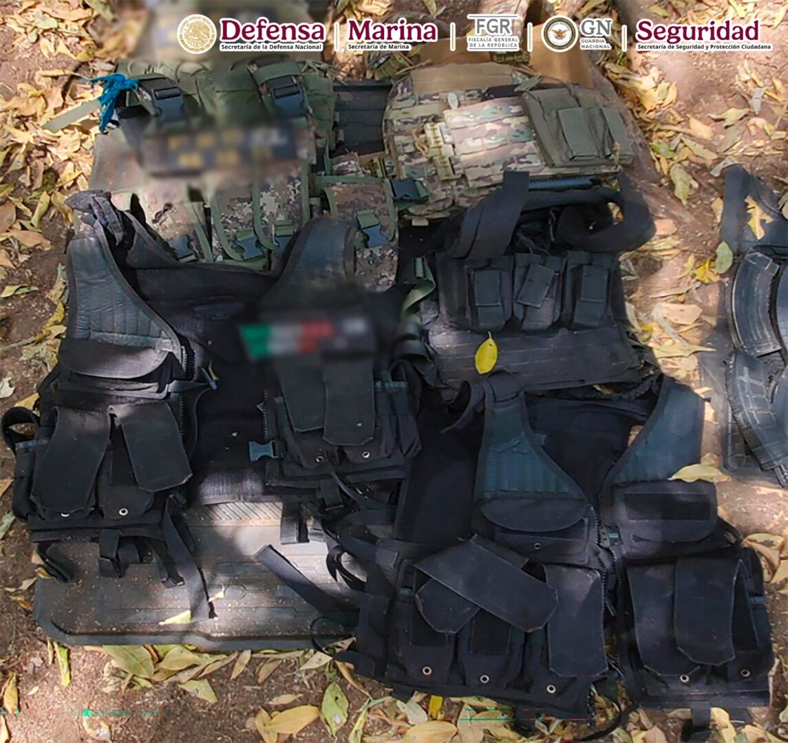 Como resultado, se interceptó un vehículo sobre la carretera Escuinapa–Teacapán, donde fueron detenidos cinco hombres, a quienes se les aseguraron siete armas largas, un arma corta, cargadores, cartuchos, seis chalecos balísticos y el vehículo en el que se trasladaban.