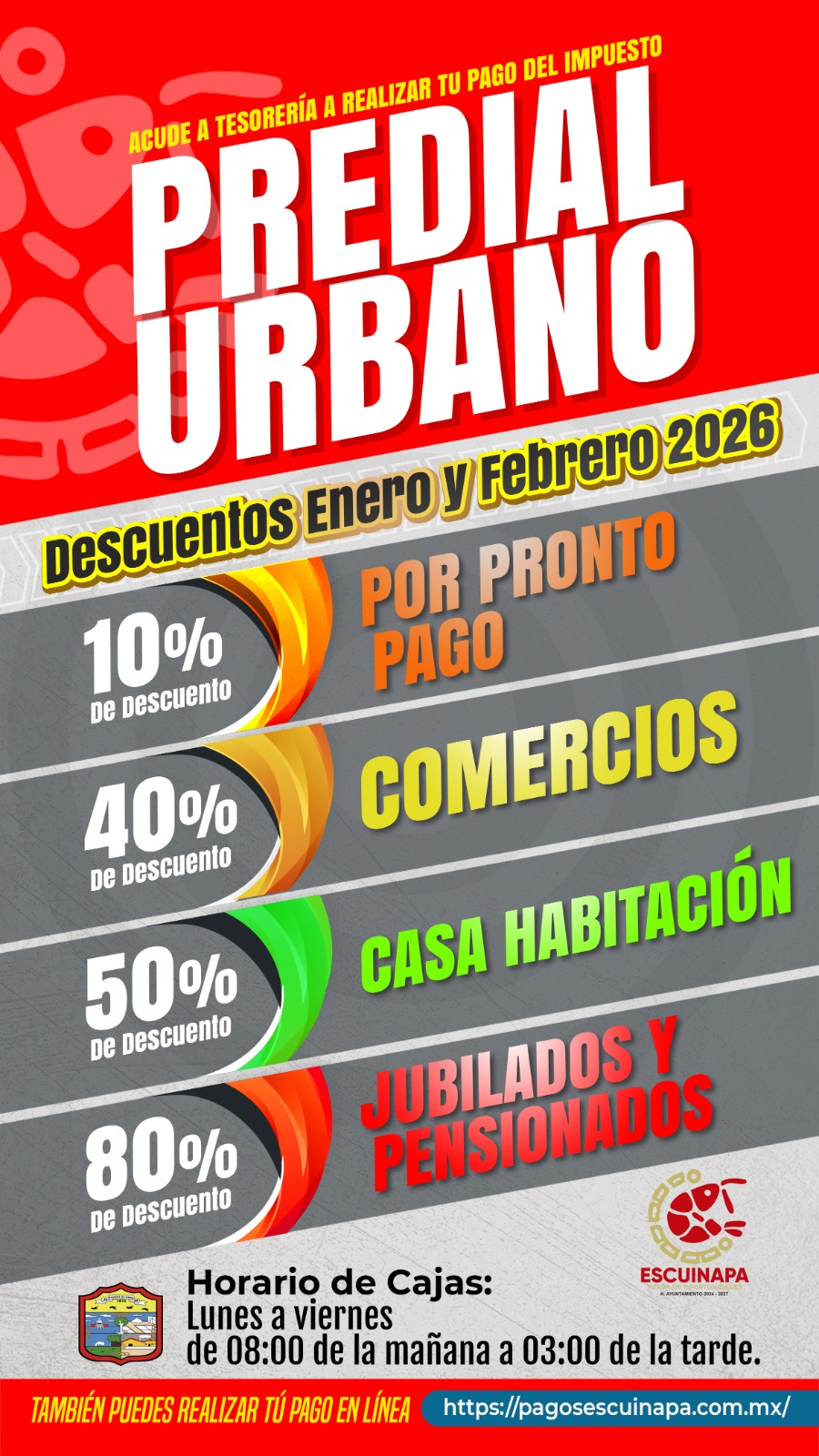 Por instrucciones del presidente municipal, Dr. Víctor Díaz Simental, y como parte de las acciones para apoyar a la economía de las familias escuinapenses, el Gobierno Municipal de Escuinapa informa que durante los meses de enero y febrero de 2026 se mantiene la extensión de horarios en las cajas de la Tesorería Municipal, a fin de facilitar el pago del impuesto predial urbano.
