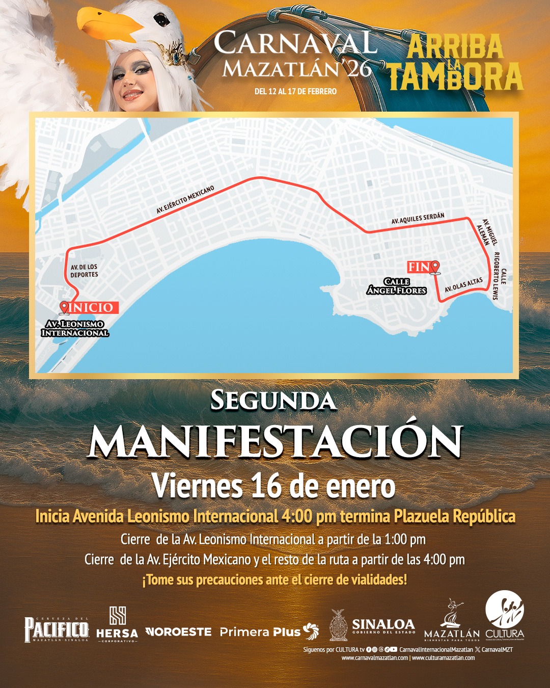 El Instituto Municipal de Cultura, Turismo y Arte invita a la población a tomar precauciones este viernes 16 de enero, pues a partir de las 13:00 horas, algunas vialidades quedarán cerradas a la circulación debido a la Segunda Manifestación del Carnaval Internacional Mazatlán 2026 ¡Arriba la Tambora!.
