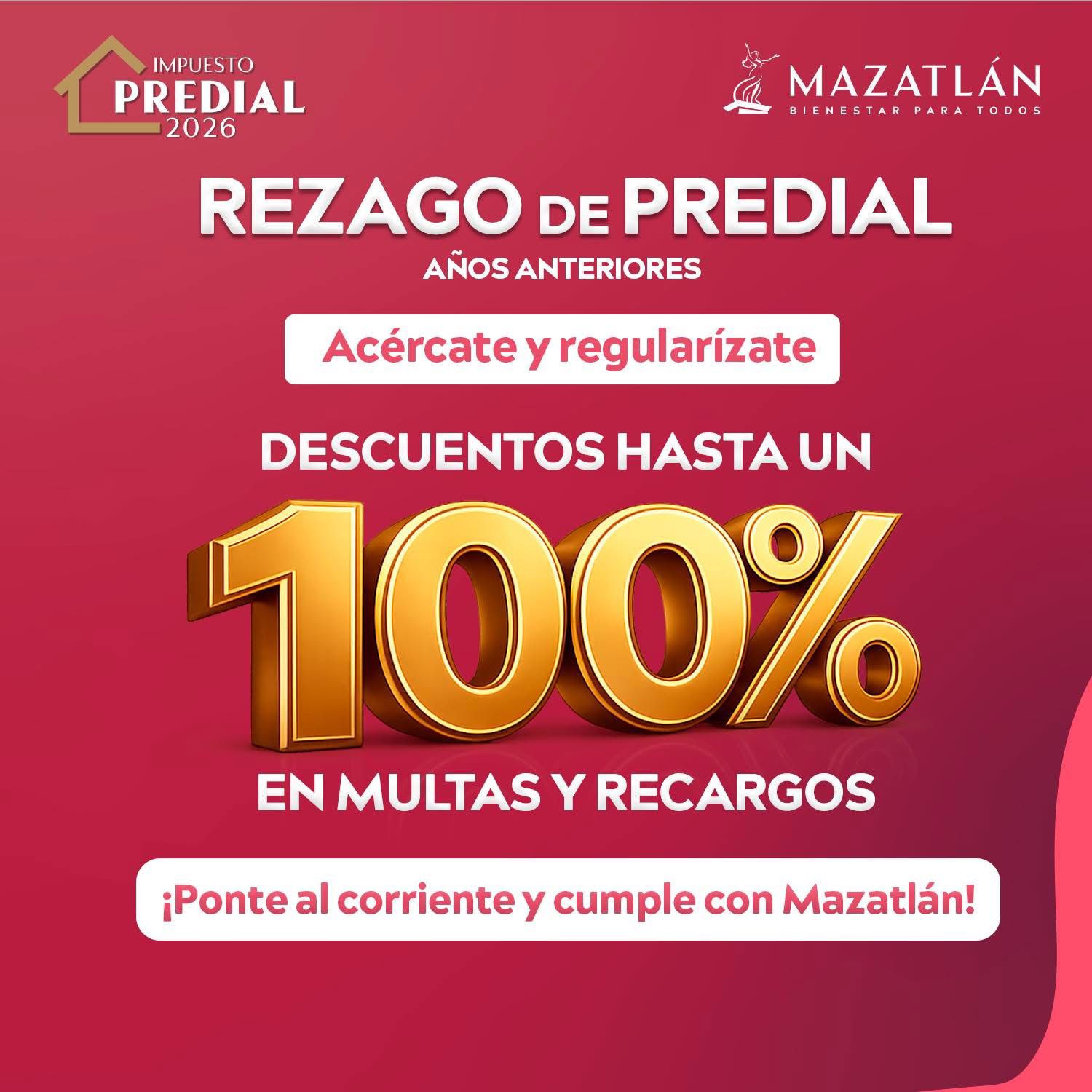 El Gobierno Municipal de Mazatlán invita a la ciudadanía que tenga adeudos en el impuesto Predial a regularizar su situación y aproveche la condonación de hasta el 100 por ciento en multas y recargos.