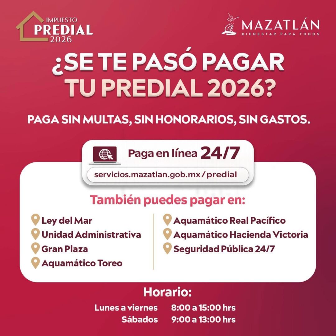 El Gobierno Municipal reitera el llamado a las y los ciudadanos con rezago de años anteriores a acercarse y aprovechar estos beneficios para ponerse al corriente con su Impuesto Predial, ya que el cumplimiento de esta contribución permite fortalecer los servicios públicos, obras y programas que impulsan el desarrollo y bienestar de Mazatlán.