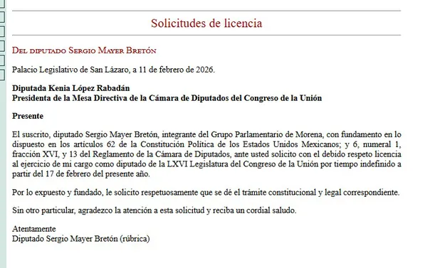 El diputado federal Sergio Mayer Bretón solicitó licencia por tiempo indefinido para separarse de su cargo en la Cámara de Diputados y participar en la nueva temporada del reality La Casa de los Famosos.