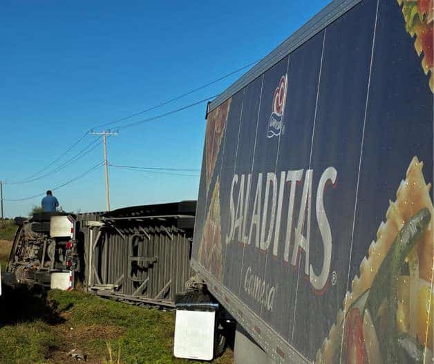 Un tráiler con doble semirremolque cargado con galletas volcó esta madrugada, mientras circulaba sobre la carretera internacional México 15, cerca de la zona de Concheros, en los límites del municipio de Juan José Ríos con Ahome.