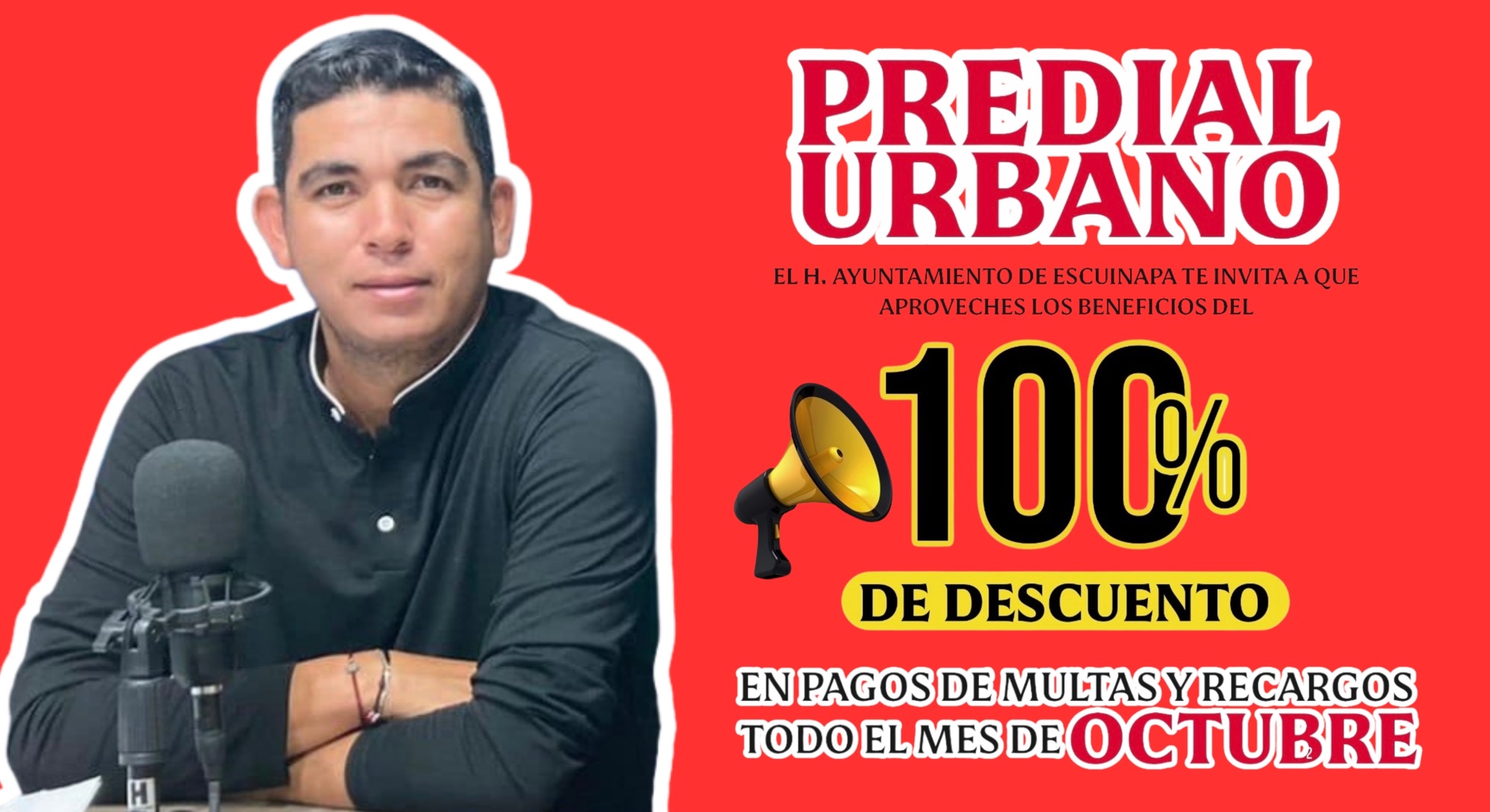 El Gobierno Municipal de Escuinapa, a través de la Tesorería Municipal, informa a la ciudadanía que durante todo el mes de octubre se estará aplicando un 100% de descuento en el pago de multas y recargos del Impuesto Predial Urbano, con el objetivo de apoyar la economía de las familias escuinapenses y fomentar el cumplimiento de sus contribuciones.