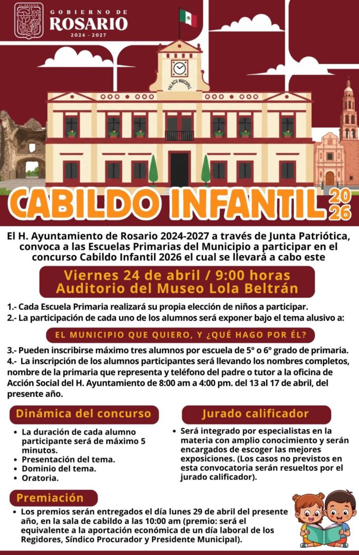 El Ayuntamiento de Rosario invita a las niñas y niños del municipio a participar en el Concurso de Cabildo Infantil 2026, una actividad que busca fomentar la participación ciudadana, el interés por la vida pública y el amor por su municipio desde temprana edad.