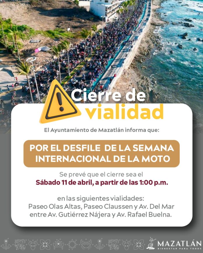Con motivo del tradicional desfile de la Semana Internacional de la Moto 2026, la Secretaría de Seguridad Pública Municipal, a través de la Unidad de Vialidad, informa sobre el cierre de circulación en la Avenida del Mar, Paseo Calussen y Olas Altas, el próximo sábado 11 de abril.