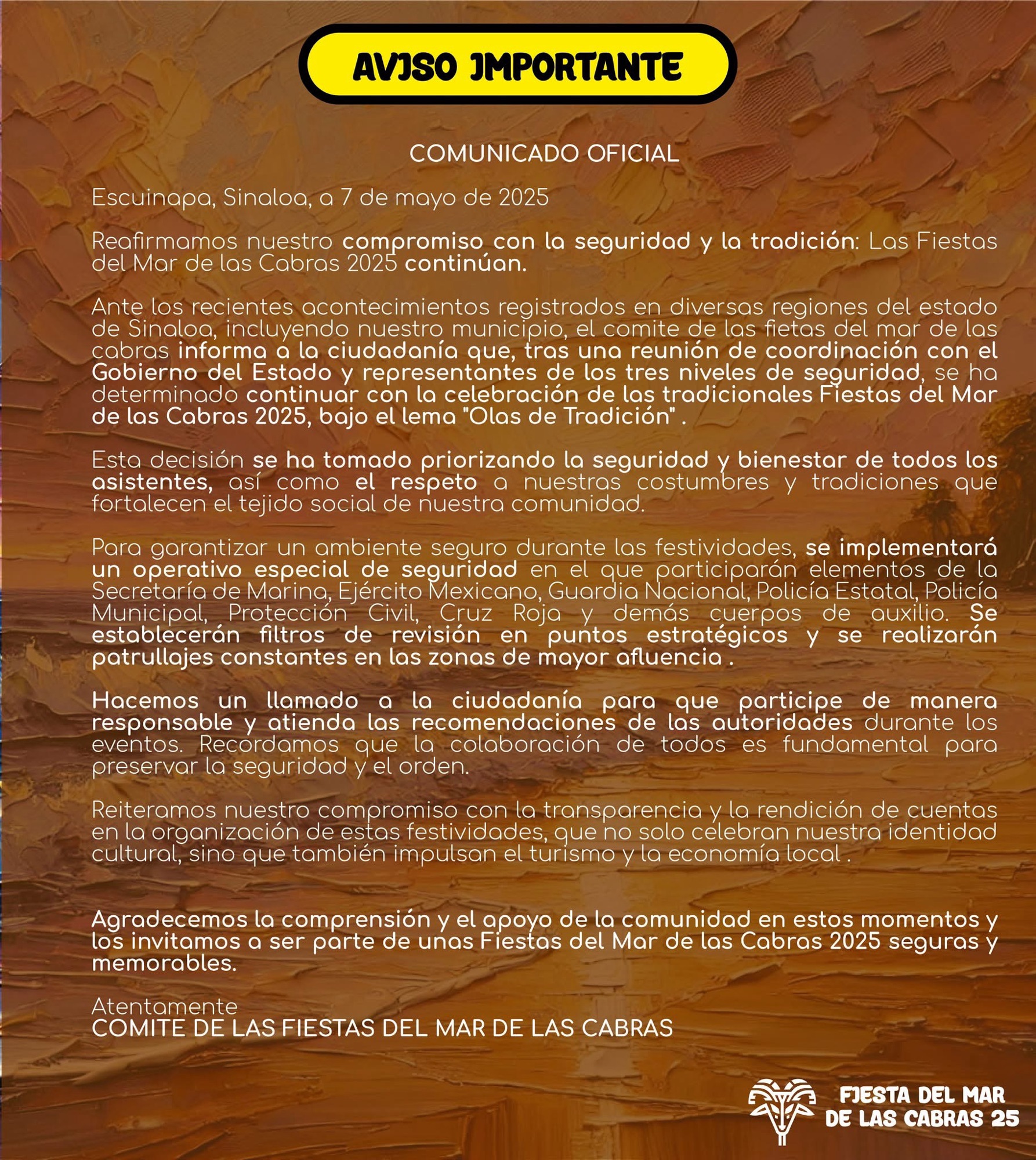 Ante los recientes acontecimientos registrados en diversas regiones del estado de Sinaloa, incluyendo nuestro municipio, el comite de las fietas del mar de las cabras informa a la ciudadanía que, tras una reunión de coordinación con el Gobierno del Estado y representantes de los tres niveles de seguridad determinado continuar con la celebración de las tradicionales Fiestas del Mor de las Cabras 2025, bajo el lema “Olas de Tradición” .