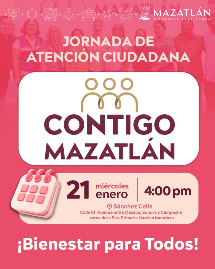 La Presidenta Municipal, Estrella Palacios Domínguez, acompañada por su Equipo del Bienestar, llevará este miércoles 21 de enero la jornada de atención ciudadana “Contigo Mazatlán” a la colonia Sánchez Celis. La actividad se desarrollará a partir de las 16:00 horas en calle Chihuahua, entre Oaxaca, Sonora y Campeche, cerca de la Escuela Primaria Narciso Mendoza.