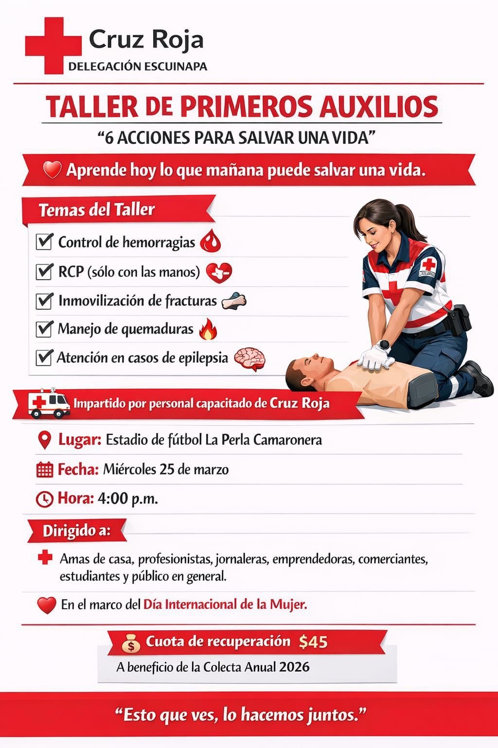 La actividad se llevará a cabo el próximo miércoles 25 de marzo a las 4:00 de la tarde, en el estadio de fútbol “La Perla Camaronera”, y será impartida por personal capacitado de Cruz Roja, quienes compartirán conocimientos básicos que permiten brindar una primera respuesta ante una emergencia.