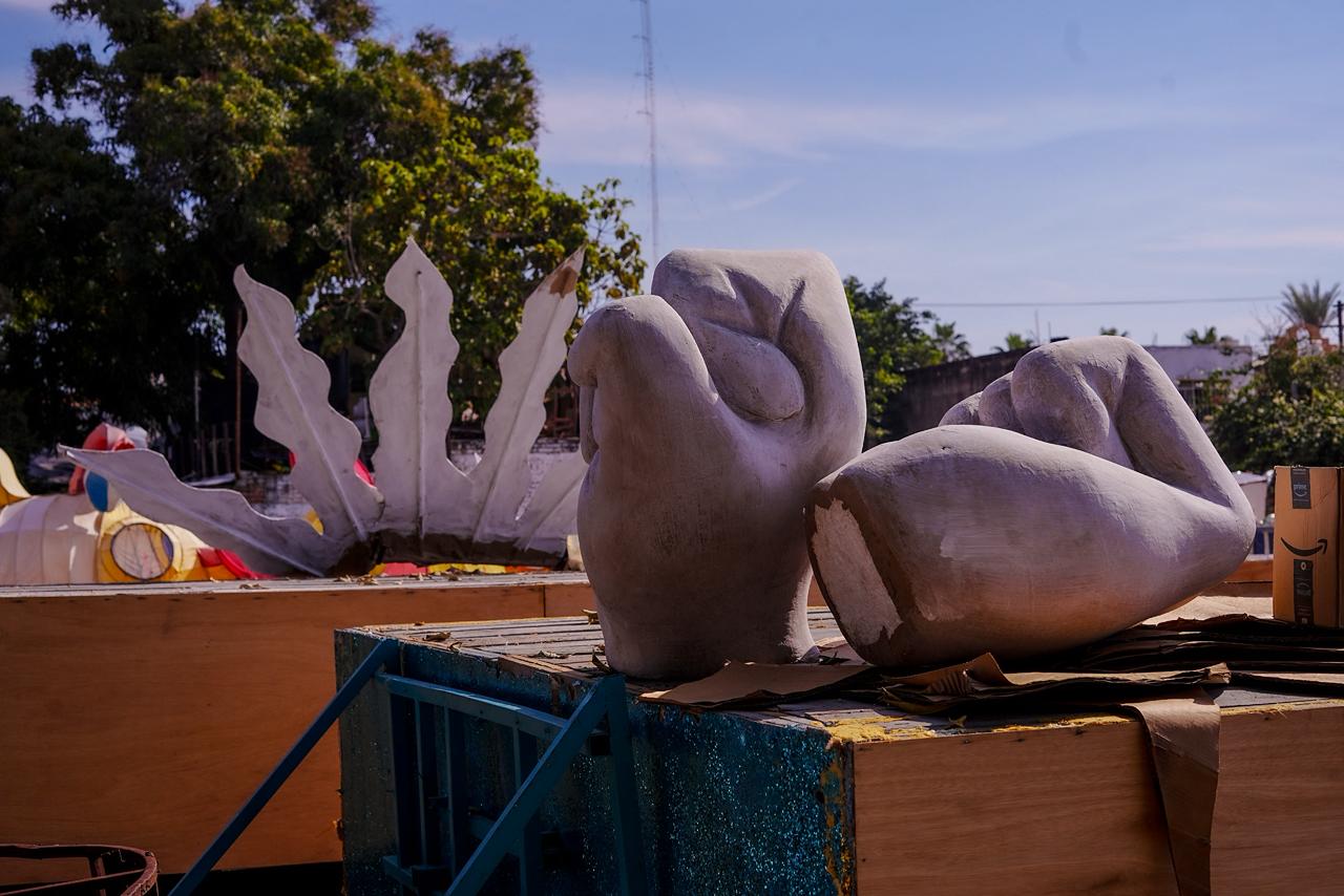 Además de las carrozas, la mancuerna Trujillo-Boronat recibió la encomienda de dar vida a dos monigotes monumentales que superan los 10 metros de altura, fusionando el moldeado estilizado con el clásico arte del alambrón.