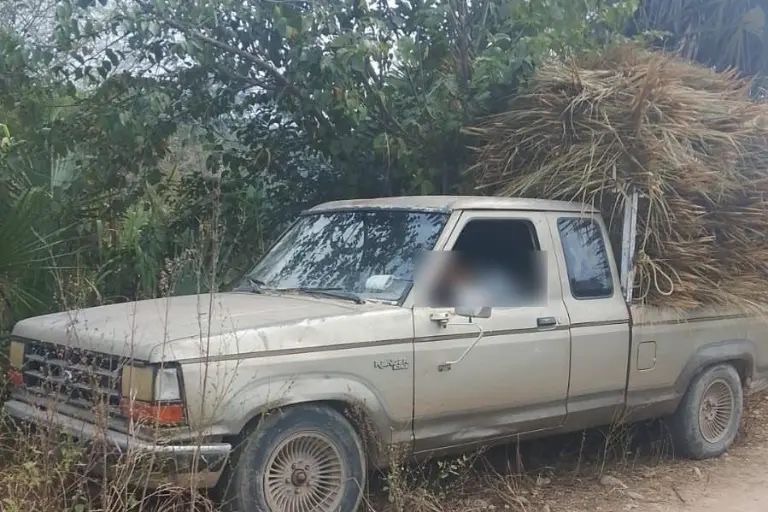 La camioneta con el cuerpo en el espacio del conductor, quedó en un camino de terracería, a un kilómetro del estadio de béisbol, en una brecha.