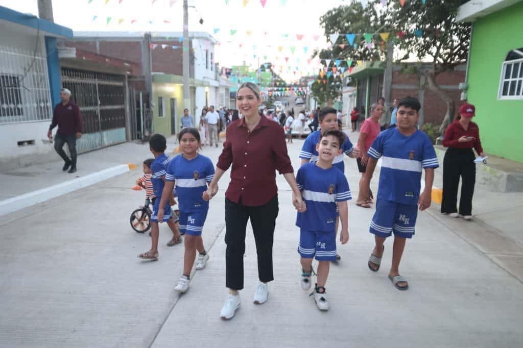 En un ambiente festivo, adornado con cientos de banderitas de colores, los vecinos de la calle Bahía Concepción, en la colonia Mazatlán III, recibieron la visita de la Presidenta Estrella Palacios Domínguez y del Gabinete del Bienestar, quienes entregaron el proyecto de pavimentación “de paquete completo”, en beneficio de cientos de personas.