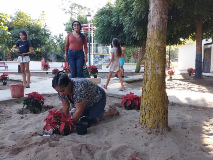 En Teacapán, la Síndica Mirna Figueroa, en coordinación con el Comité de Obras y el grupo “Las Pachangueras”, realizó la colocación de las nochebuenas en la plazuela central, acompañada del encendido del Pino Navideño.