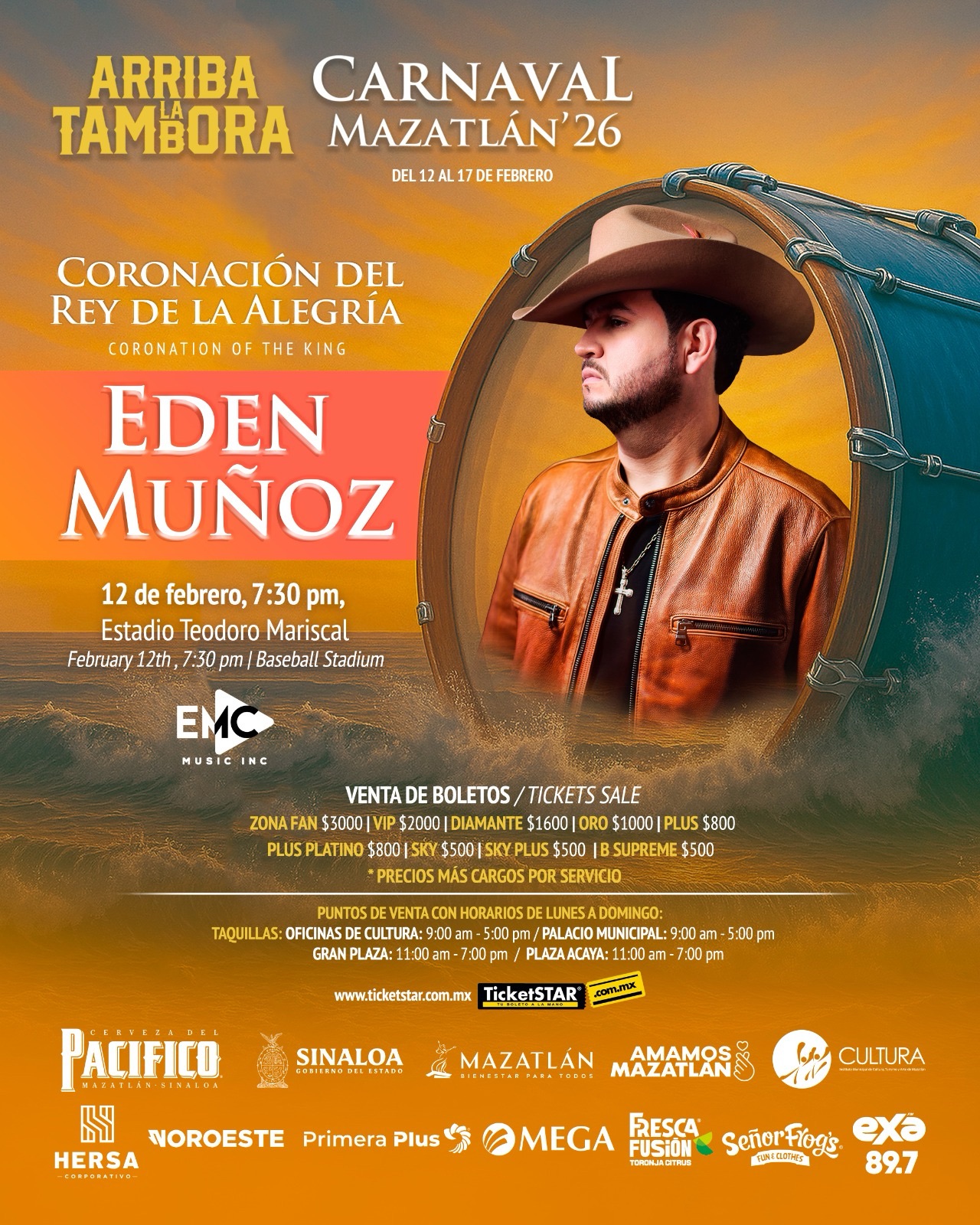 La cita es este jueves 12 de febrero, a las 7:30 de la noche, en el Estadio Teodoro Mariscal, que se vestirá de gala para recibir a Edén Muñoz, encargado de poner el ritmo, la emoción y la voz a una velada que marcará el inicio formal de los días más intensos de la máxima fiesta de los mazatlecos.