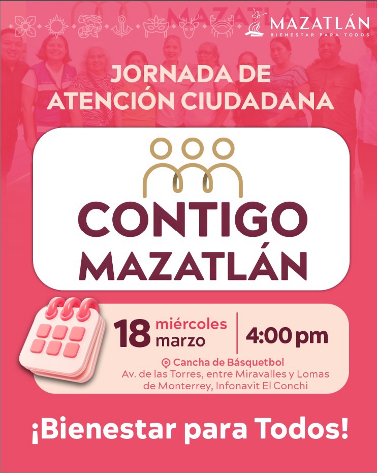 El Gobierno Municipal, que encabeza la Presidenta Estrella Palacios Domínguez, continúa fortaleciendo la cercanía con la ciudadanía a través de la jornada de atención “Contigo Mazatlán”, que en esta ocasión se llevará a cabo en el Infonavit El Conchi, con el objetivo de brindar atención directa y oportuna a las familias del sector.
