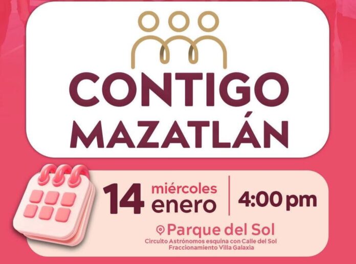 El Gobierno Municipal de Mazatlán llevará a cabo este miércoles la jornada de atención ciudadana “Contigo Mazatlán”, iniciativa encabezada por la Presidenta Estrella Palacios Domínguez, junto al Gabinete del Bienestar. En esta ocasión, las actividades se desarrollarán en el fraccionamiento Villa Galaxia, como parte de las acciones para fortalecer la cercanía con la ciudadanía y atender de manera directa sus necesidades.