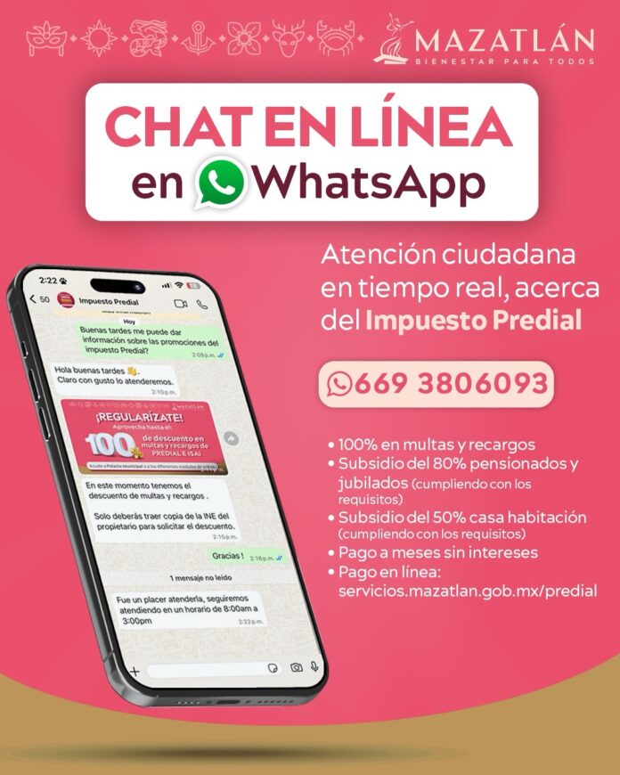 El Gobierno Municipal de Mazatlán puso en marcha un nuevo canal de atención ciudadana en tiempo real a través de WhatsApp, con el objetivo de facilitar a las y los contribuyentes la consulta y pago del Impuesto Predial, así como la resolución de dudas de manera ágil y directa.