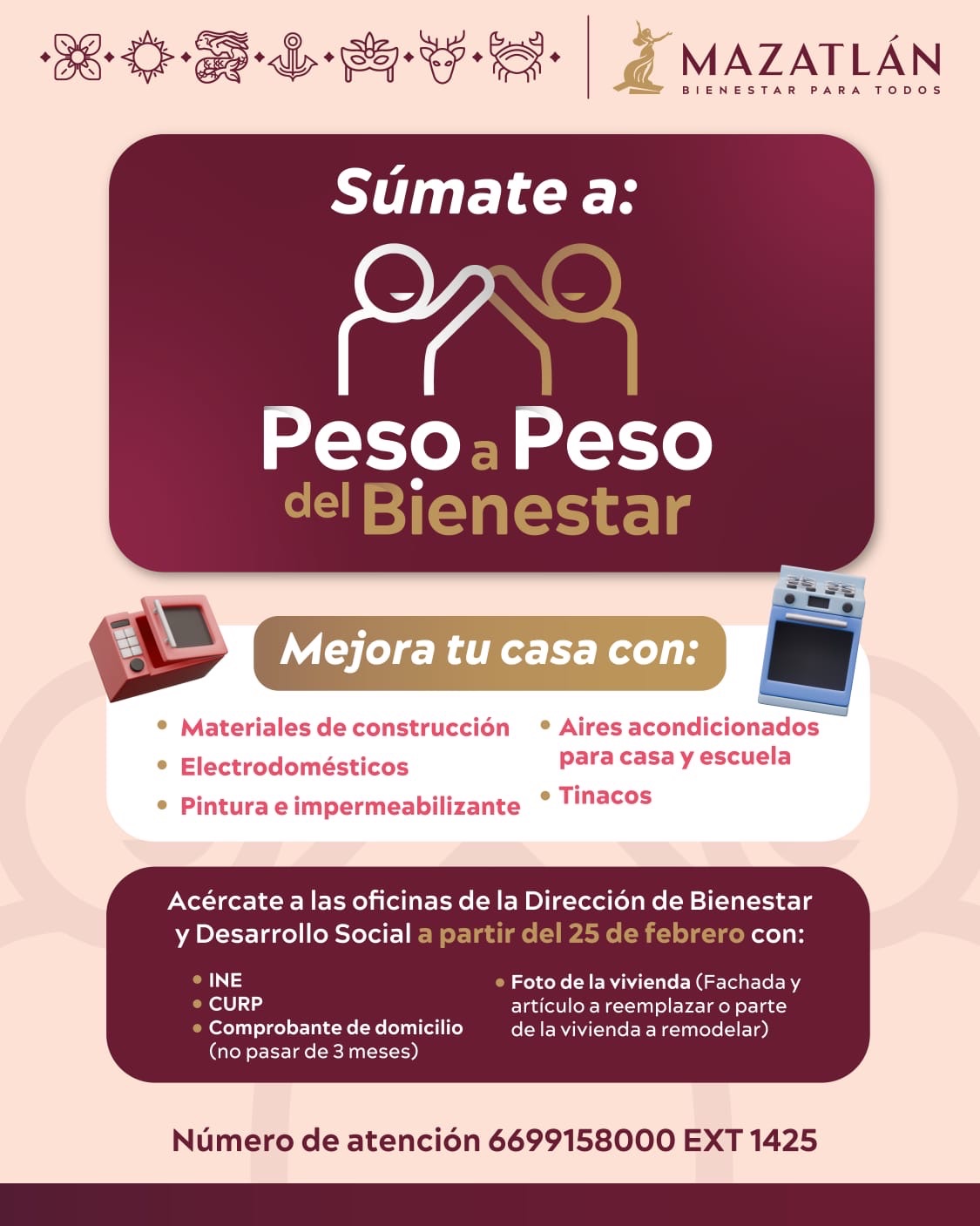 La Presidenta Municipal, Estrella Palacios Domínguez, anunció que este miércoles 25 de febrero se lanzará la convocatoria del programa “Peso a Peso del Bienestar” para el ejercicio 2026, con el objetivo de apoyar la economía de las familias mazatlecas.