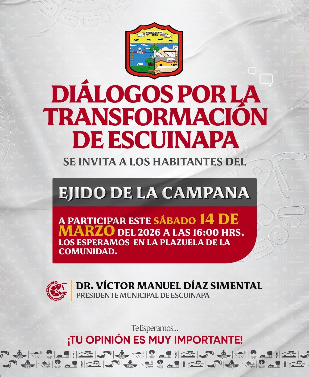 Con el objetivo de fortalecer la participación ciudadana y escuchar de manera directa las necesidades de la población, el Gobierno Municipal de Escuinapa, encabezado por el Dr. Víctor Díaz Simental, invita a las y los habitantes del Ejido de La Campana a participar en el encuentro ciudadano “Diálogos por la Transformación de Escuinapa”.
