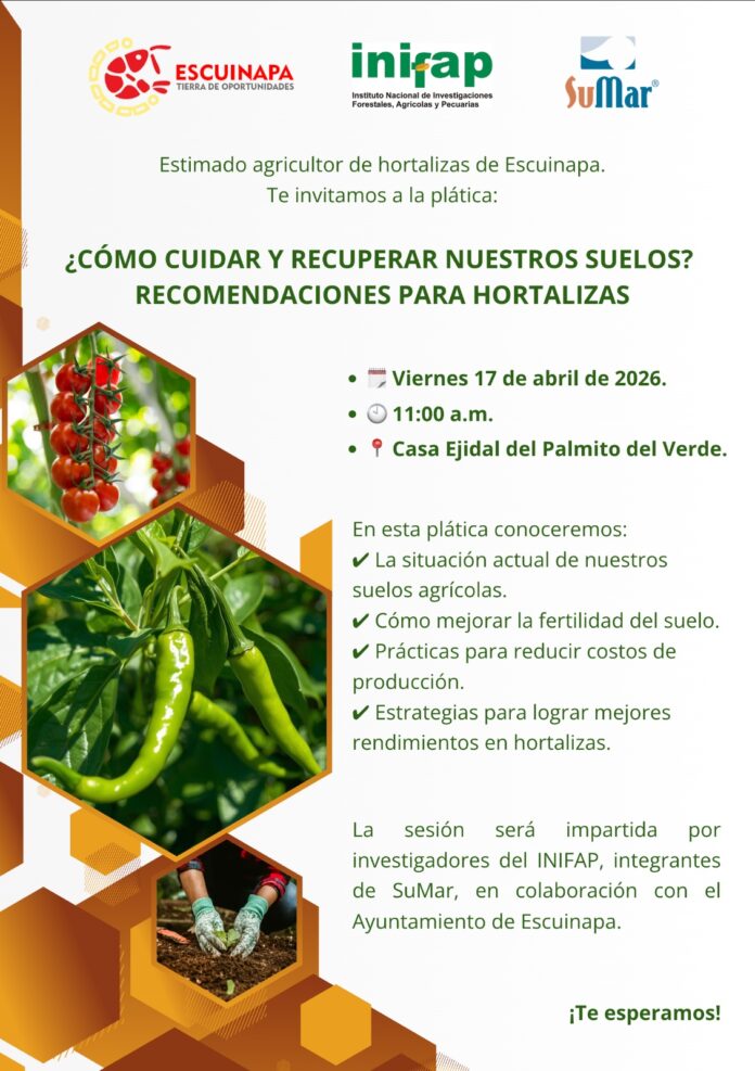 Como parte de las acciones para fortalecer el sector agrícola en el municipio, el Gobierno de Escuinapa que encabeza el Dr. Víctor Díaz Simental, en coordinación con el Instituto Nacional de Investigaciones Forestales, Agrícolas y Pecuarias (INIFAP) y SuMar, invita a los productores de hortalizas a participar en la plática “¿Cómo cuidar y recuperar nuestros suelos? Recomendaciones para hortalizas”.