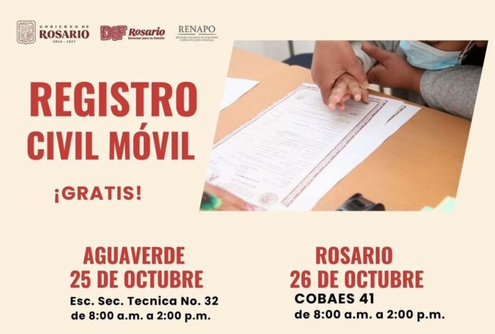 Con la finalidad de acercar servicios y trámites de identidad legal, el Gobierno Municipal de Rosario a través del Sistema Dif Municipal y en coordinación con Registro Civil Estatal, llevarán a cabo dos jornadas de registro donde podrán realizar trámites de registro de nacimiento, defunción, matrimonio, CURP, reconocimiento y aclaraciones.