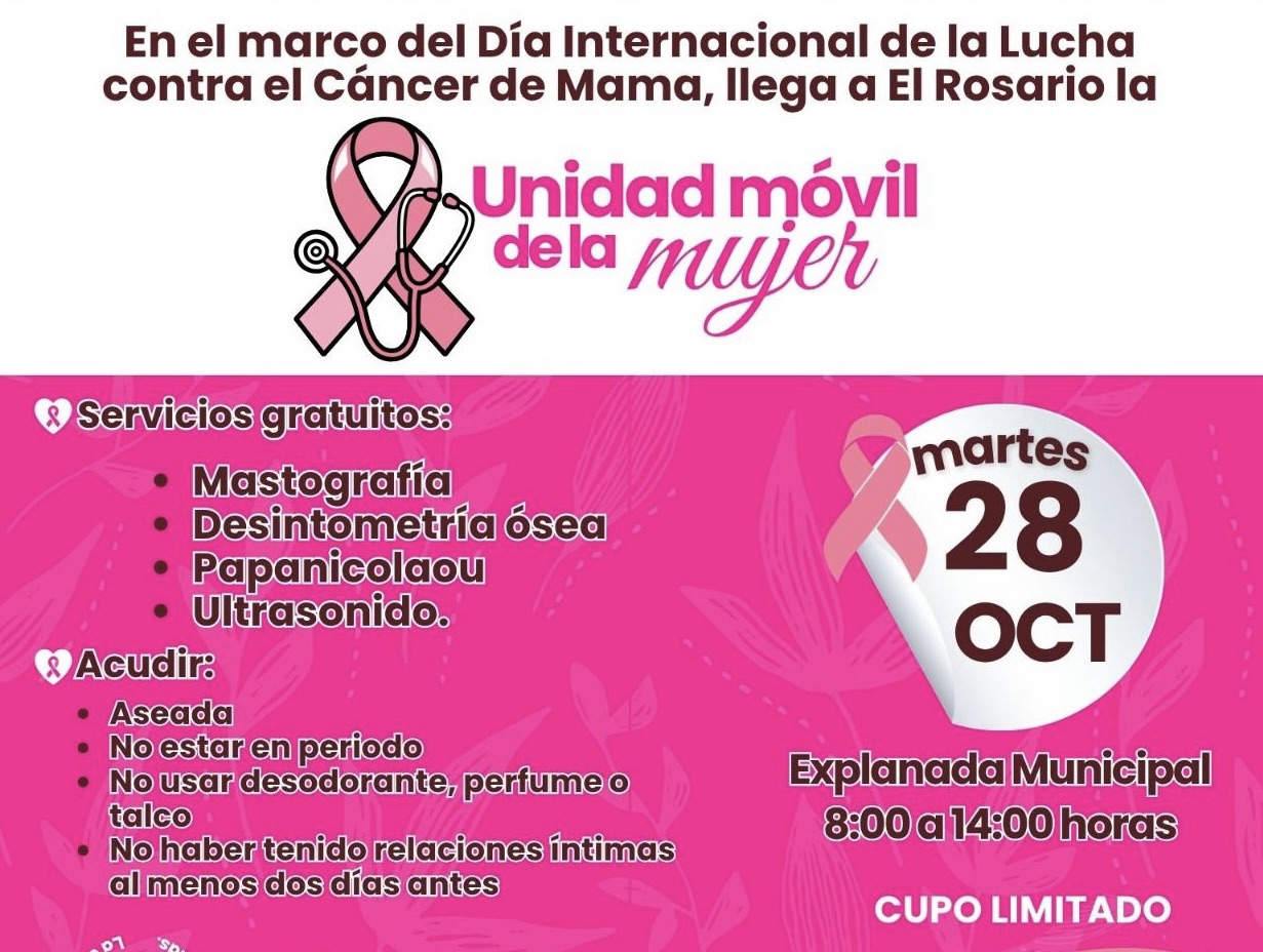 En el marco del Día Internacional de la Lucha contra el Cáncer de Mama, llegará al municipio de Rosario la Unidad Móvil de la Mujer para ofrecer servicios de salud gratuitos.