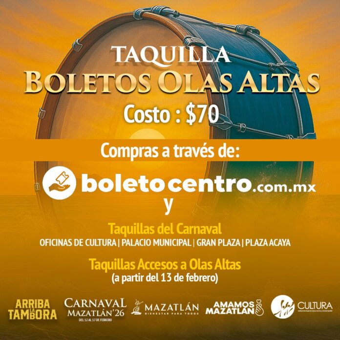 Bajo el lema “Arriba la Tambora”, el área de Olas Altas vivirá una transformación histórica durante las noches del Carnaval Internacional Mazatlán 2026 ¡Arriba la Tambora!, programado del 12 al 17 de febrero. Este año, la monumental fiesta junto al mar estará amenizada exclusivamente con música de banda, el acceso se mantiene en 70 pesos, por primera vez el público podrá comprar sus boletos a través de una boletera digital y habrá una taquilla itinerante en Mazatlán, La Cruz de Elota, Villa Unión, Concordia, El Rosario, Escuinapa y Acaponeta.