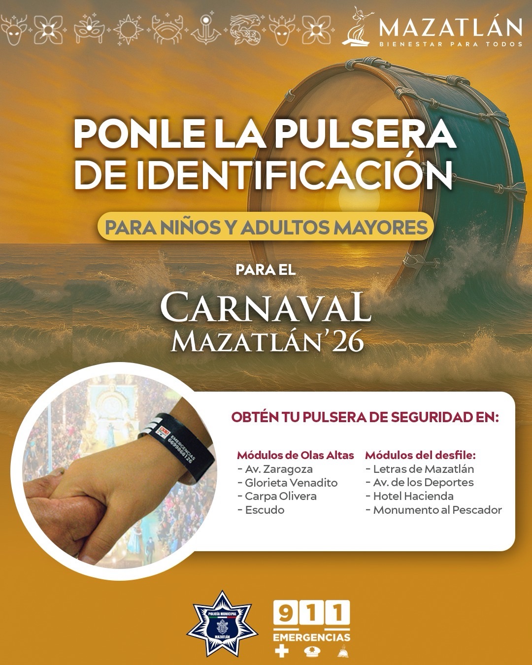 La Secretaría de Seguridad Pública Municipal, a través del Departamento de Programas Preventivos, puso en marcha la campaña “Diviértete Seguro, Usa tu Pulsera”, con la finalidad de brindar mayor protección a niñas y niños que asistan con sus familias a las diversas actividades del Carnaval.