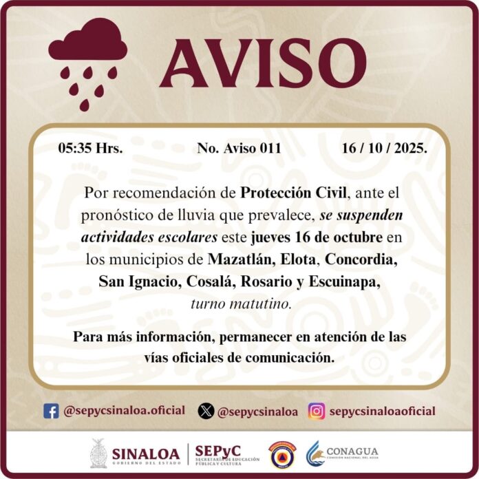 Por recomendación de Protección Civil, ante el pronóstico de lluvia que prevalece, se suspenden actividades escolares este jueves 16 de octubre en los municipios de Mazatlán, Elota, Concordia, San Ignacio, Cosalá, Rosario y Escuinapa, turno matutino.