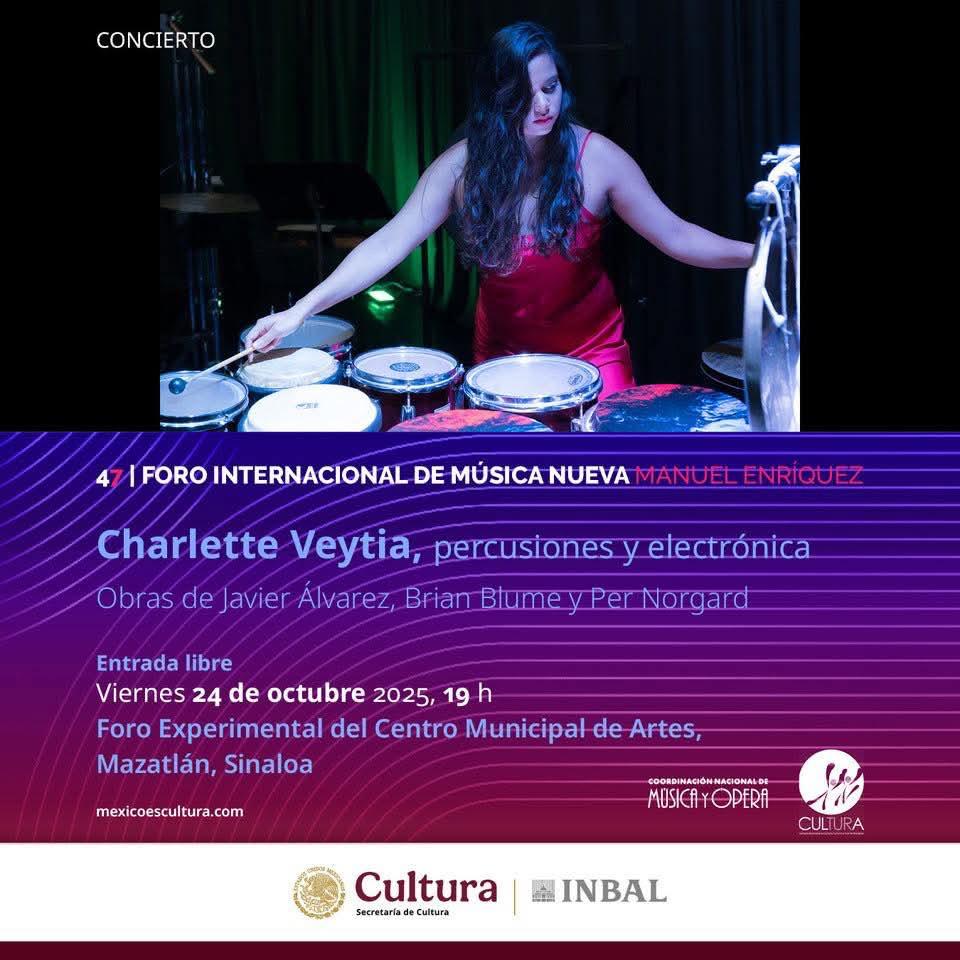 Charlette Veytia, destacada intérprete y creadora mazatleca, egresada de la Escuela de Música del Instituto Municipal de Cultura, Turismo y Arte de Mazatlán y colaboradora del Ensamble de Percusiones se presentará en el 47° Foro Internacional de Música Nueva “Manuel Enríquez” (FIMNME), el viernes 24 de octubre de 2025, a las 19:00 horas, en el Foro Experimental del Centro Municipal de las Artes, con entrada libre.