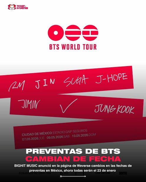 “Las preventas ARMY MEMBERSHIP para los conciertos de Ciudad de México del próximo BTS World Tour ARIRANG han sido reprogramadas para el viernes 23 de enero”, anunció la empresa organizadora del evento.