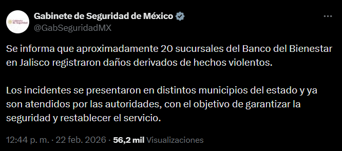 “Se informa que aproximadamente 20 sucursales del Banco del Bienestar en Jalisco registraron daños derivados de hechos violentos. Los incidentes se presentaron en distintos municipios del estado y ya son atendidos por las autoridades, con el objetivo de garantizar la seguridad y restablecer el servicio”.