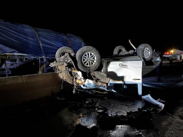 Durante este choque múltiple, una camioneta pickup de la marca Ford, línea F-150, de color blanco y una pickup de la marca Nissan, línea NP300 del mismo color, terminaron volcadas con las llantas hacia arriba.