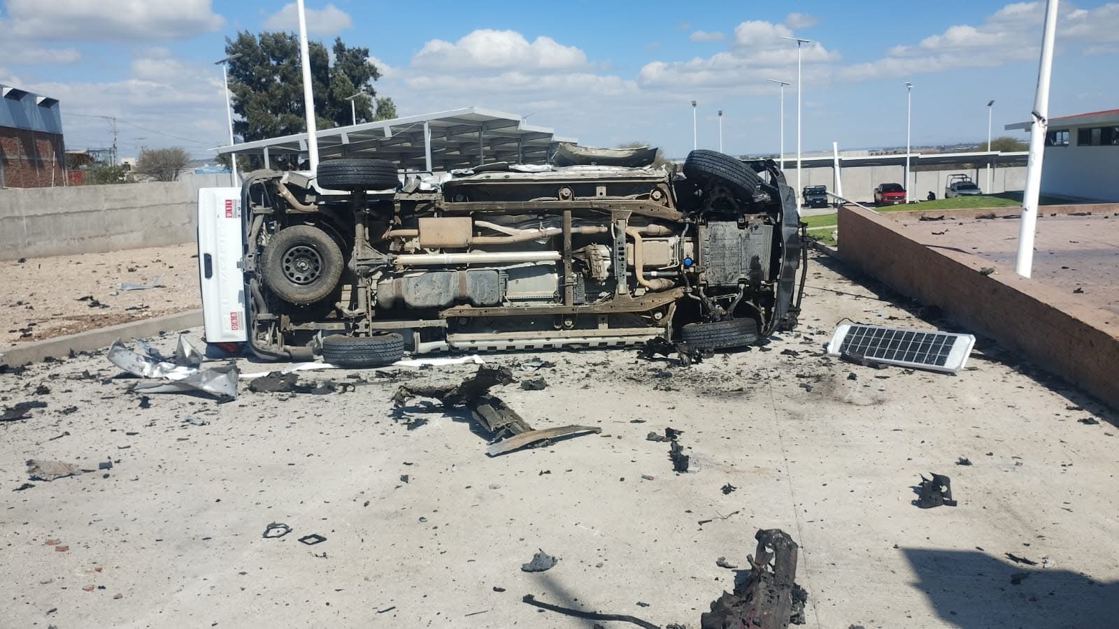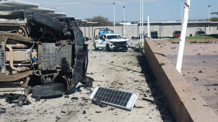 En el sitio se aprecian las unidades con decenas de impactos de bala de grueso calibre, además de vehículos volcados al interior de la base de la Guardia Nacional.