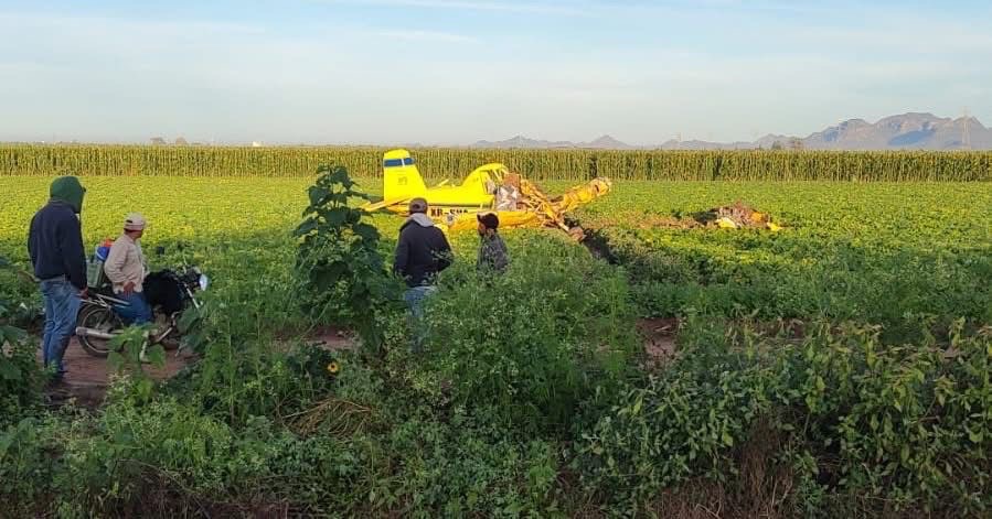 Una avioneta dedicada a la fumigación de campos agrícolas, terminó desplomándose en plenas actividades de fumigación en el Ejido 5 de Mayo, en Ahome.