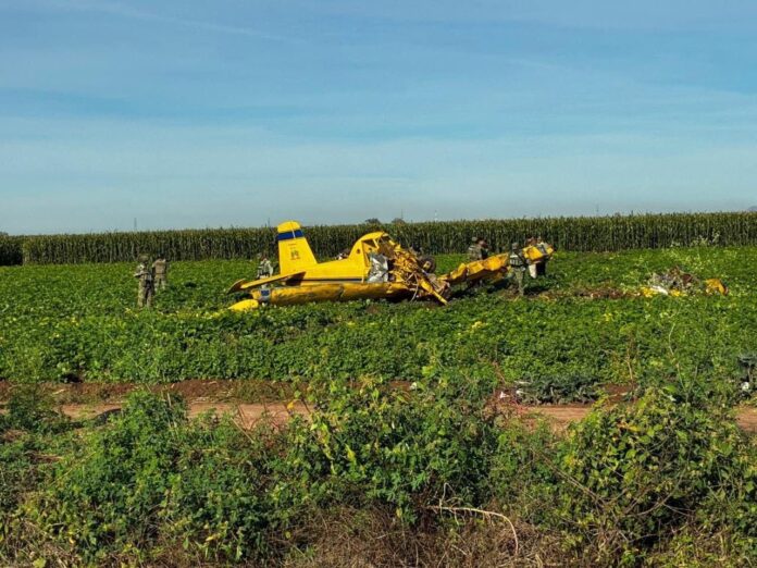 Una avioneta dedicada a la fumigación de campos agrícolas, terminó desplomándose en plenas actividades de fumigación en el Ejido 5 de Mayo, en Ahome.