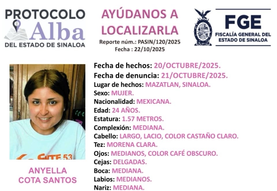 Mediante una ficha de búsqueda, bajo el Protocolo Alba, la Fiscalía General del Estado, solicita la colaboración para localizar a la maestra Anyella Cota Santos, quien está desaparecida desde el pasado 20 de Octubre.