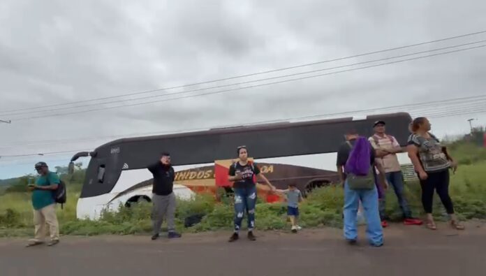 Tremendo susto se llevaron los tripulantes de un camión de pasajeros luego de que este se saliera de la carretera al realizar una maniobra para evitar chocar con otros automóviles.