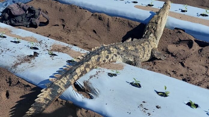 Un cocodrilo que paseaba tranquilamente en medio de una parcela en la zona del valle de Escuinapa, provocó la movilización de los cuerpos de auxilio, quienes lo capturaron para reubicarlo en su habitad.
