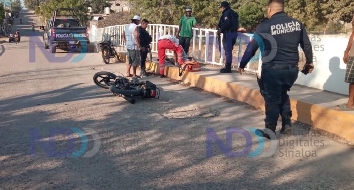 Un hombre lesionado y miles de pesos en daños materiales es el saldo del choque entre dos motocicletas sobre el puente con cruza el Arroyo Buñigas en la Colonia Pueblo Nuevo en Escuinapa.