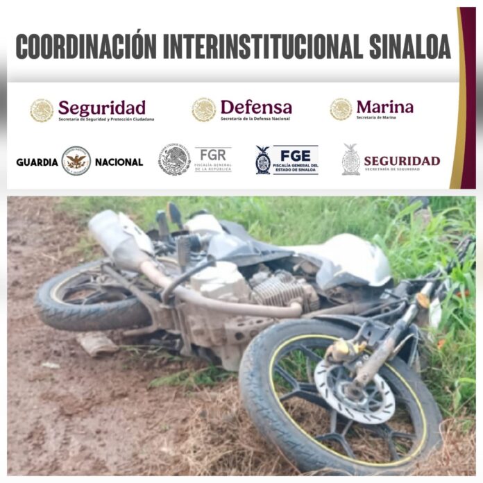 Lo Personal del Ejército Mexicano, en coordinación con la Guardia Nacional, la Secretaría de Marina, la Secretaría de Seguridad y Protección Ciudadana, la Fiscalía General de la República, la Fiscalía General del Estado y la Secretaría de Seguridad Pública de Sinaloa, a través de la Policía Estatal Preventiva, aseguró un arma de fuego y una motocicleta tras repeler una agresión en el municipio de Rosario.