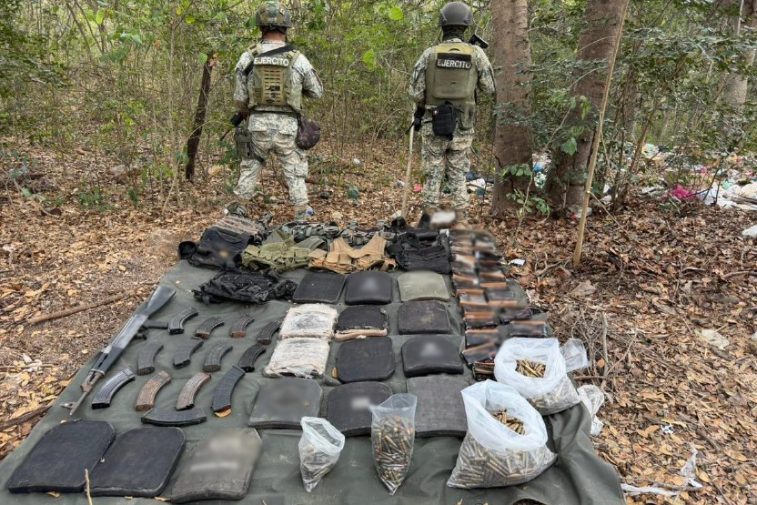 Elementos del Ejército Mexicano, en coordinación con la Guardia Nacional, la Secretaría de Marina, la Secretaría de Seguridad y Protección Ciudadana, la Fiscalía General de la República, la Fiscalía General del Estado y la Secretaría de Seguridad Pública del Estado, en Rosario, aseguraron armas, cargadores, cartuchos y chalecos tácticos.