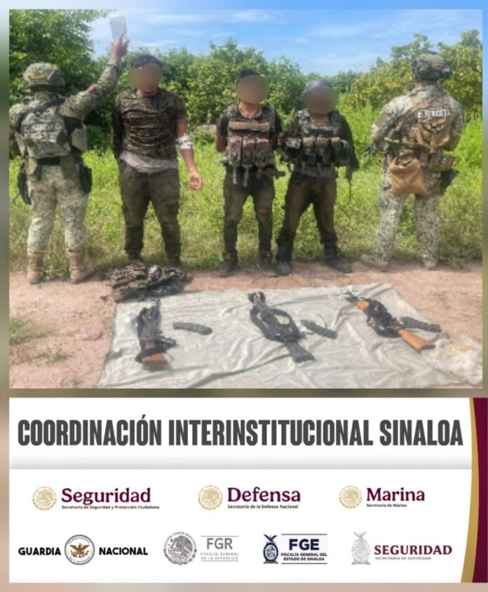 Elementos del Ejército Mexicano, en coordinación con la Guardia Nacional, la Secretaría de Marina, la Secretaría de Seguridad y Protección Ciudadana, la Fiscalía General de la República, la Fiscalía General del Estado y la Secretaría de Seguridad Pública de Sinaloa, a través de la Policía Estatal Preventiva, detuvieron a tres hombres a quienes les aseguraron armas largas, municiones y equipo táctico.