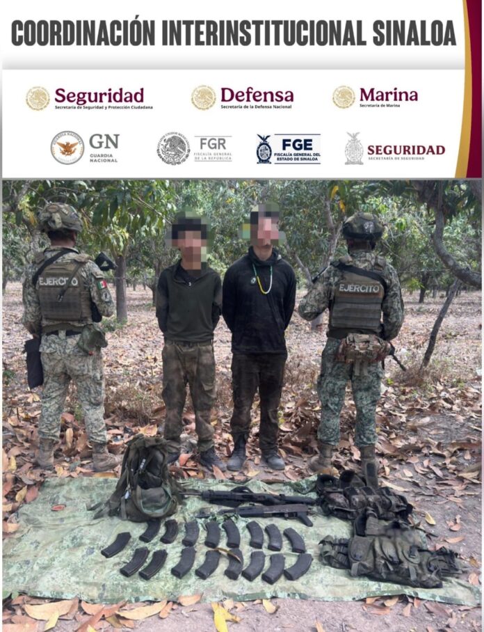 Elementos del Ejército Mexicano, en coordinación con la Guardia Nacional, la Secretaría de Marina, la Secretaría de Seguridad y Protección Ciudadana, la Fiscalía General de la República, la Fiscalía General del Estado y la Secretaría de Seguridad Pública del Estado, detuvieron, en Escuinapa, a dos civiles a quienes se les aseguraron armas, cargadores, cartuchos y chalecos tácticos.
