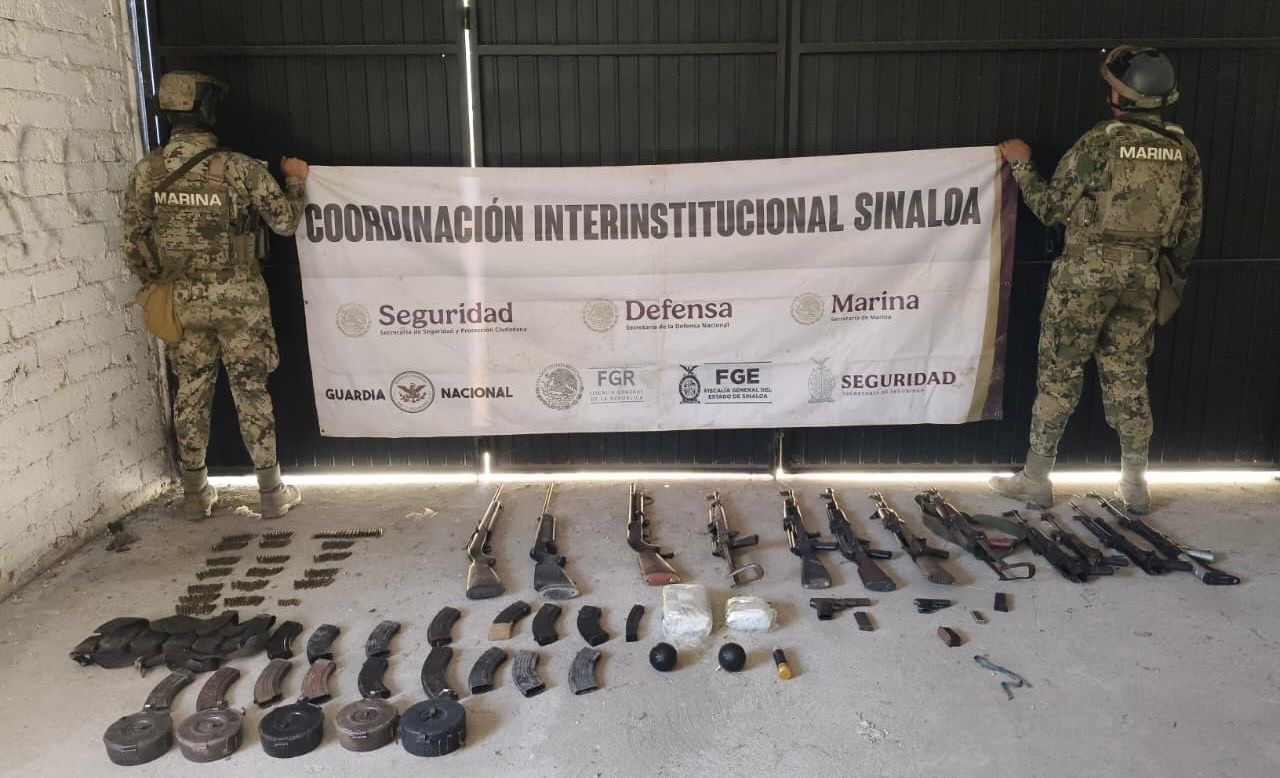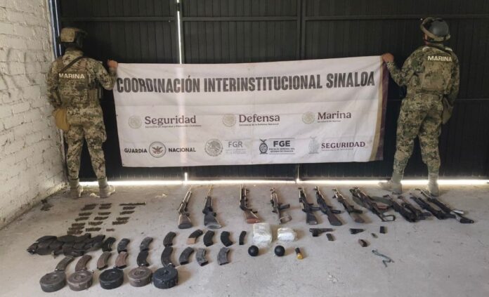 Elementos de la Secretaría de Marina, en coordinación con el Ejército Mexicano, la Guardia Nacional, la Secretaría de Seguridad y Protección Ciudadana, la Fiscalía General de la República, la Fiscalía General del Estado y la Secretaría de Seguridad Pública de Sinaloa, a través de la Policía Estatal Preventiva, aseguraron armas largas, explosivos, municiones y precursores químicos en el municipio de Escuinapa.