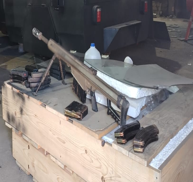 Elementos de Fiscalía General de la República, Ejército Mexicano y Policía Estatal catearon un inmueble, aseguraron un fusil Barrett, 21 cargadores, 348 cartuchos y dos vehículos con blindaje artesanal.