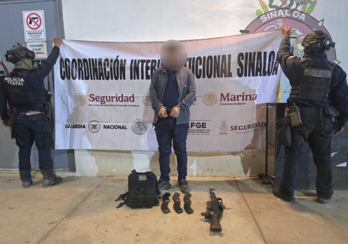 Personal de la Secretaría de Seguridad Pública del Estado, a través del Grupo de Operaciones Especiales de Sinaloa (GOES) de la Policía Estatal Preventiva, en coordinación con el Ejército Mexicano, la Guardia Nacional, la Secretaría de Marina, la Secretaría de Seguridad y Protección Ciudadana y la Fiscalía General de la República, así como la Fiscalía General del Estado, detuvo a un masculino a quien le aseguraron un fusil, cargadores y municiones.
