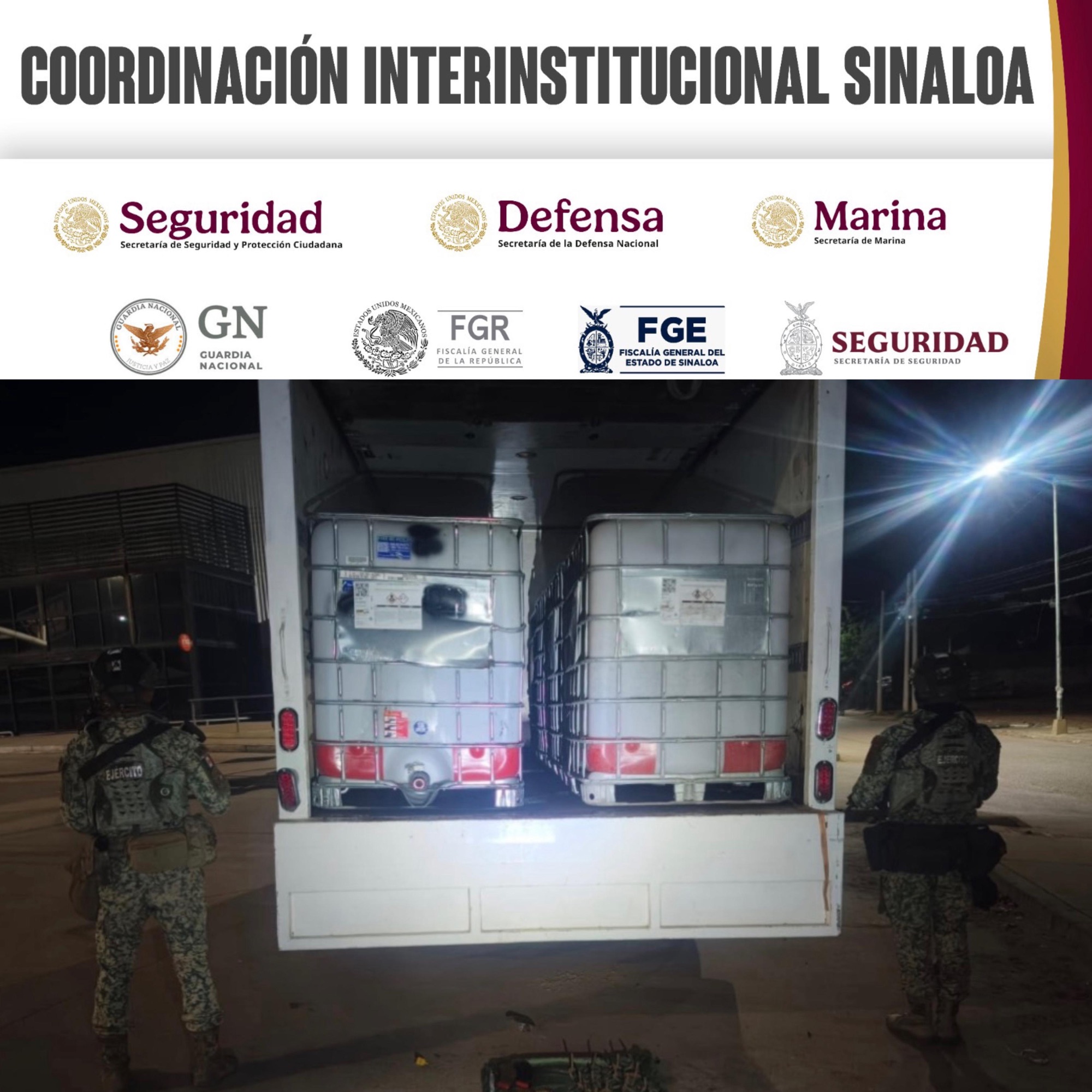 Personal del Ejército Mexicano, en coordinación con la Guardia Nacional, la Secretaría de Marina, la Secretaría de Seguridad y Protección Ciudadana, la Fiscalía General de la República, la Fiscalía General del Estado y la Secretaría de Seguridad Pública del Estado, a través de la Policía Estatal Preventiva, aseguró en el municipio de Mazatlán un vehículo con bidones para el traslado de gasolina, así como ponchallantas, cargadores y cartuchos en su interior.