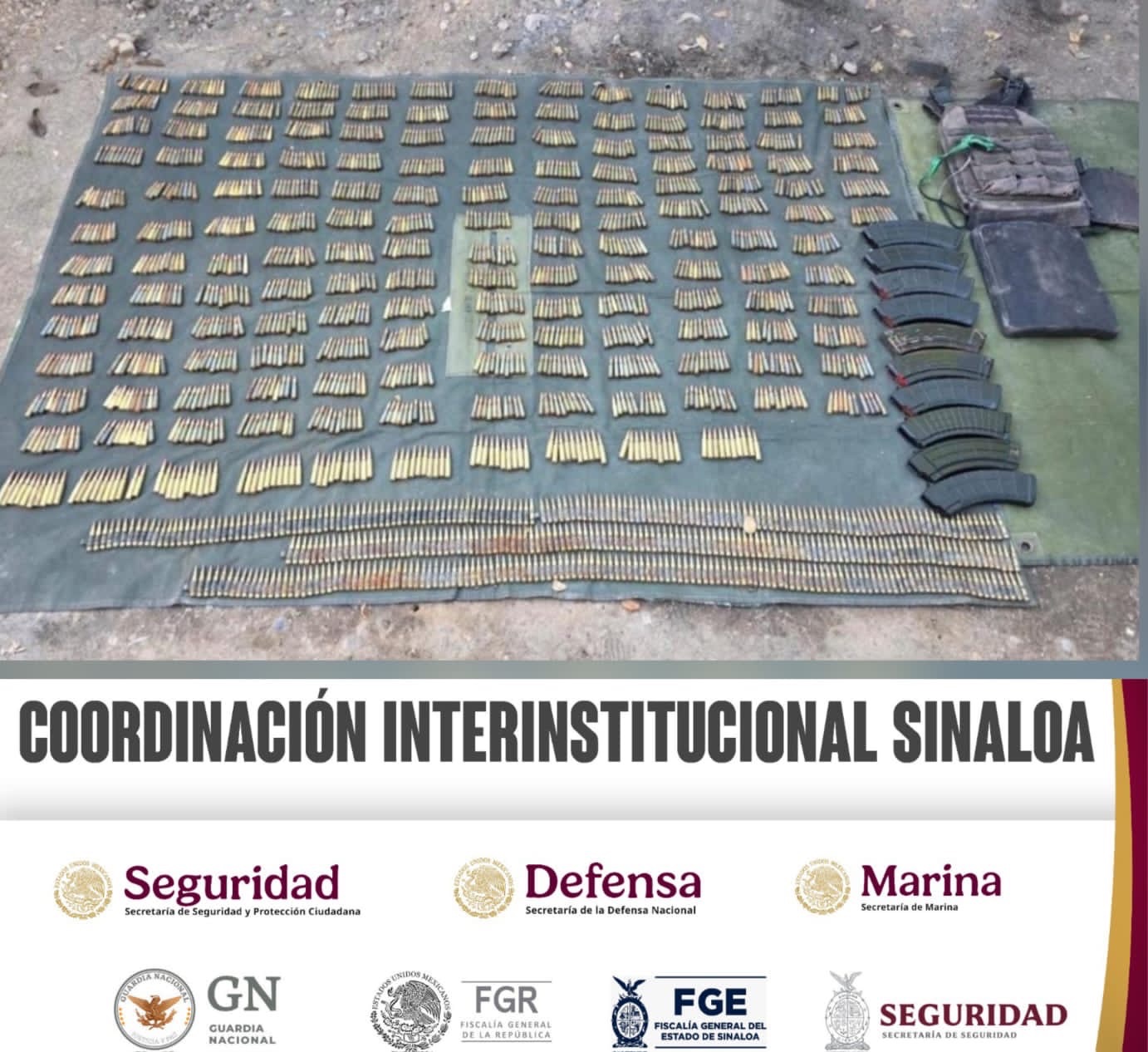 Elementos del Ejército Mexicano, en coordinación con la Guardia Nacional, la Secretaría de Marina, la Secretaría de Seguridad y Protección Ciudadana, la Fiscalía General de la República, la Fiscalía General del Estado y la Secretaría de Seguridad Pública del Estado, aseguraron cartuchos, así como un chaleco táctico.